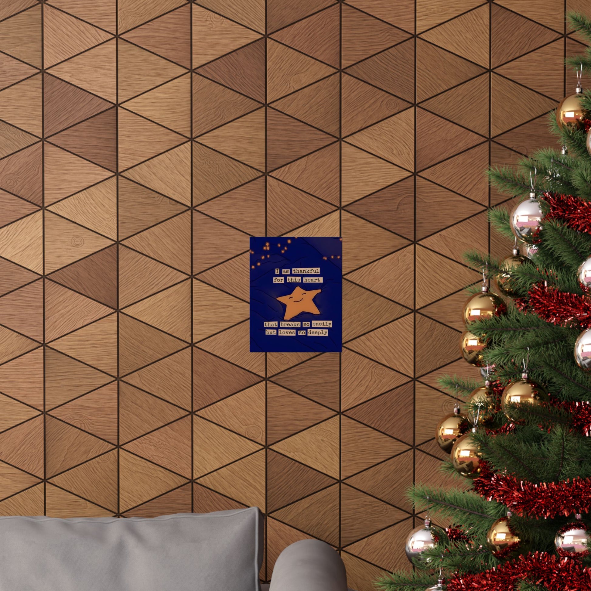 This matte vertical poster pairs warm, handwritten text with a sleepy, smiling star against a deep indigo backdrop. The message—“I am thankful for this heart that breaks so easily but loves so deeply”—feels like a quiet late-night affirmation, made for someone who wears their emotions openly. Soft string lights and gentle folds in the background give the piece a cozy, intimate atmosphere that settles any room into a reflective mood. Printed with museum-grade archival paper and giclée inks, the artwork keeps its deep blues and golden tones vivid without glare thanks to the matte finish. Hang it in a bedroom, reading nook, or near a window where evening light pools; it’s meant to be the kind of small, steady comfort that you notice each night before sleep.